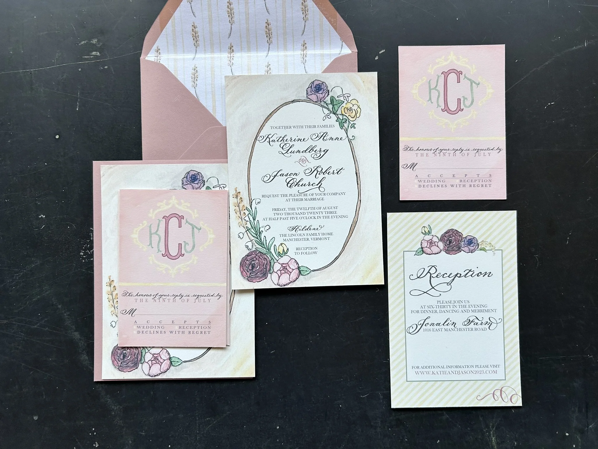 Custom Designer Watercolor Wedding Invitation Pricing with Full Calligraphy
